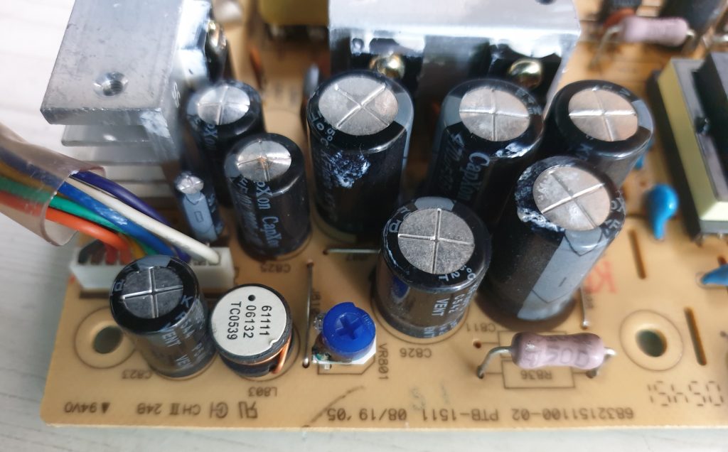 보통 육안으로 부풀어 오른 콘덴서 2~3개만 교체해도 모니터 전원은 당장 켜집니다. 하지만 이 모델은 2005년에 생산된 제품입니다. 부풀어 오르지 않은 나머지 정상 모양의 콘덴서들 역시 내부에 있는 전해액이