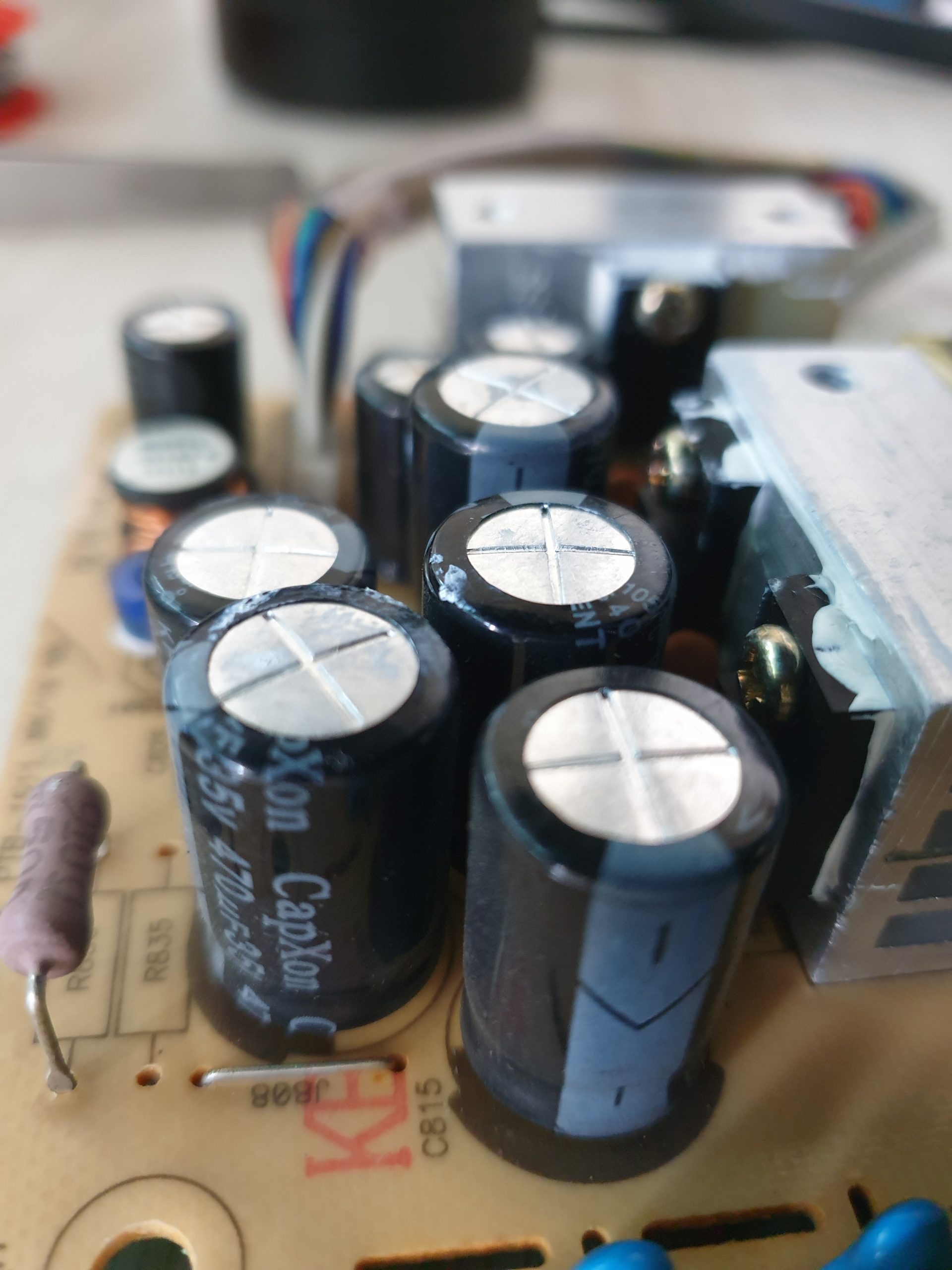 따라서 이번 수리에서는 완벽한 내구성을 위해, 문제가 된 콘덴서뿐만 아니라 파워보드 2차 출력단에 위치한 모든 전해 콘덴서를 고품질, 고온(105℃) 새 부품으로 전부 교체 하였습니다.